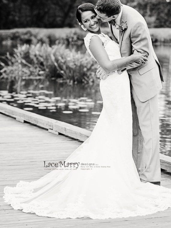 Buy Unique Lace Wedding Dress With Dipped Illusion Neckline And Online In India Etsy
